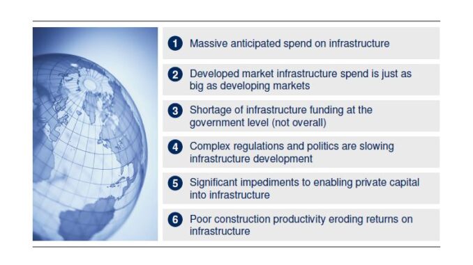 A massive spend on infrastructure, globally about $50 trillion, is expected over the next two decades. It is anticipated that the infrastructure spend in the developing countries market is just as large as in the developed countries market. But infrastructure spending growth is significantly higher in the developing countries market. In many countries there is a shortage of infrastructure funding from governments. This set the stage for greater private investment. But there are significant impediments preventing private capital from playing a greater role in funding infrastructure. Complex regulations and politics which slow infrastructure development and poor construction productivity are important factors in eroding returns on infrastructure and making infrastructure less attractive for private investment.