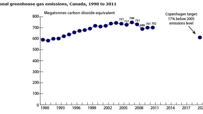 Based on 2011 emissions and existing regulations the Government of Canada estimates the country will produce 734 MT of greenhouse gases in 2020, or 122 MT higher than its committment target in Copenhagen.