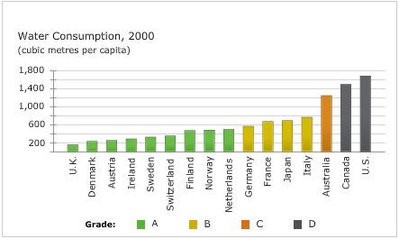 In 2000 Canadians used over 300 litres of water per person per day. Canada’s water consumption per capita was over nine times greater than the U.K.. Only the U.S. consumed more water per person.