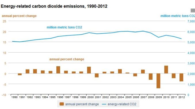 According to the U.S. Energy Information Administration (EIA) absolute energy-related carbon dioxide emissions declined 3.8 percent in 2012 at the same time the U.S. GDP grew by 2.8% in 2012..