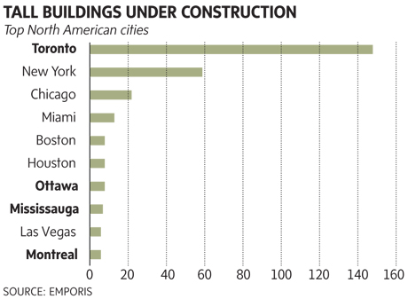 It is interesting that the top 10 includes Singapore and Toronto, both relatively small from a population perspective. According to a recent report, Toronto leads other cities in North America by a considerable margin in number of tall buildings under construction, most of which are residential.