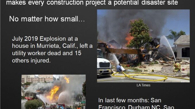 Underground utility infrastructure represents a substantial risk to workers and the public. Most damage to underground infrastructure is the result of construction excavation, recent examples include Murrieta CA, Durham NC, and San Francisco CA. But inadequately maintained, aging and abandoned infrastructure whose location is unknown or poorly known is also a significant hazard as shown by the events in St Bruno, Merrimack, and Lawrence. It is instructive to compare statistics for incidents in the commercial airline industry with those for underground utility damage. But whereas the number of fatalities and incidents involving commercial aircraft in the U.S. has declined consistently from its high in 1929, the latest Common Ground Alliance DIRT Report reveals that the number of underground utility damage events in 2018 shows no indication of decreasing from previous years, even when prorated to the total construction spending per year.