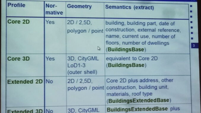 In response to a question from the audience, she said that the next version of CityGML will incorporate some of the specifications from INSPIRE Buildings that would move in the direction of harmonizing the two models.