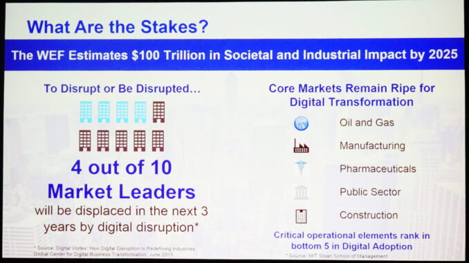 From a technology perspective just about every speaker referred to the lack of progress on productivity in the construction industry. Engineering and construction are second from the bottom on the IT adoption chart. But Wipro, Booz Allen Hamilton, Aconex, Jacobs, and other vendors and analyst McKinsey believe that the construction industry is poised for the digitization revolution. Vendors are investing heavily in technology including artificial intelligence, digital modeling such as BIM and full lifecycle BIM or BIM++ as one speaker referred to it, machine learning, drones, neural networks, virtual reality, big data, analytics, automation and hyperautomation.