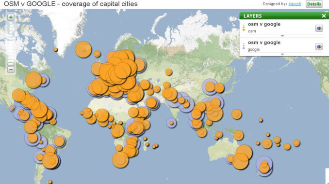 I just came across a comparison of OpenSteetMap and Google/Teleatlas prepared by Steve Chilton of Middlesex University using work begun by Bernard Zwischenbrugger and Alex Mauer. The size of the circles are proportional to the coverage in the city, so small circles represent poor coverage and large circles good coverage.