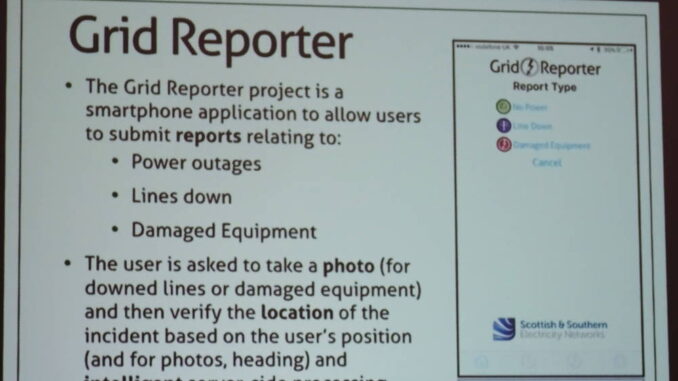 Everytime I attend Distributech I come across something that simply knocks my socks off. Alan McMorran of Open Grid Systems has been working with Scottish and Southern Electricity Networks (SSEN) and Electricity North West (ENW) on a “Grid Reporter” application that crowdsources information from users with smart phones about outages.