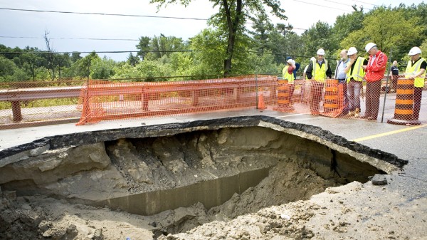 According to the Globe and Mail, two sinkholes shut down traffic on a major artery in Toronto. One sinkhole is five metres wide and 14 metres deep. It is suspected that a 60-year-old, 18-inch corrugated metal storm water pipe about 10-12 metres below the surface collapsed. A recent article points out that this type of thing happens more often then we think. (Photo Jennifer Roberts/Globe and Mail)
