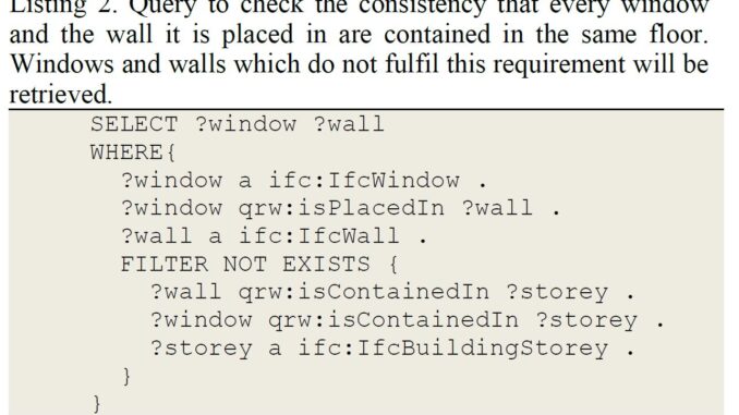 In the AEC domain, a typical use case is data integrity validation against BIM standards or building code requirements. A Dutch example is the Dutch BIM standard requires that all building elements should be associated with appropriate building storey. Provided that the building model is represented in the standardized ifcOWL, it is possible to check this spatial containment relationship using off-the-shelf SPARQL implementation.