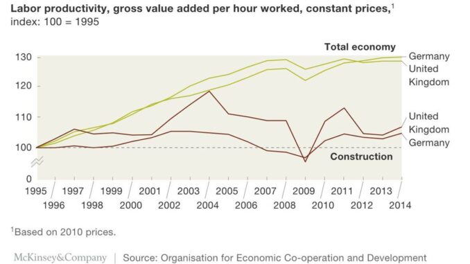$10 trillion is spent on construction goods and services every year. But whereas the average worker adds $37 of value for every hour worked, a construction worker adds only $25 per hour worked. Construction productivity has stagnated over the past decades in many of the world’s advanced economies.