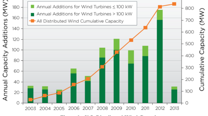 The U.S. Department of Energy (DoE) has just released an interesting report on distributed wind energy in the U.S. Distributed wind is defined by the wind project’s location relative to end-use, rather than on turbine or project size. Distributed wind power is used at or near where it is generated, as opposed to wind power from wholesale generation, where power is sent to consumers via transmission lines and substations. The distributed wind market includes wind turbines from very large to small domestic turbines. DoE breaks the market into two segments: “small wind” with turbines 100 kW or less and wind turbines greater than 100 kW.