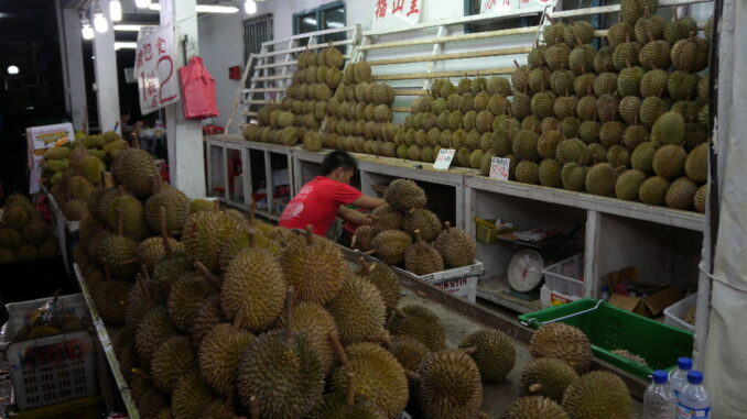 Tonight Lyn Chua and her husband Jameson took us out to the durian market here in Singapore for dessert. There were not only piles of durians, but there were several different varieties. Here’s our dessert. Of all the ways I have had durian, this is really the best way to have it.