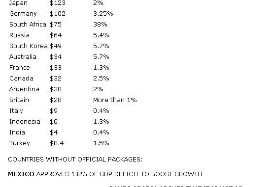France, Britain, Italy, Indonesia, Turkey, and India are planning to spend less than 2%. Saudi Arabia says it is not as seriously impacted by the economic downturn.