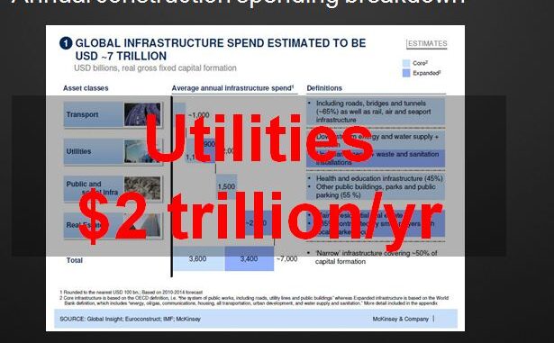Growing population, increasing urbanization and environmental concerns are putting a strain on existing infrastructure including electricity and other energy networks, water and wastewater, road and rail, airports and seaports. It is estimated that an investment in infrastructure of between $24 to 53 trillion will be required worldwide over the next two decades. Governments are increasingly devoting their limited resources to services, so much of this investment will have to come from the provate sector which will drive increased returns on investment (ROI) if infrastructure is going to attract the private investors it requires. This will focus the construction industry, designers, engineers, architects, and construction contractors on improved productivity in an industry where productivity has stagnated in the US, EU, Japan and Korea over the past decades. The convergence of building information modeling (BIM), new geospatial data and technology such as LiDAR, and 3D visualization is changing how we design, buld and operate and maintain buildings and infrastructure and is resulting in increased efficiency and reduced risk. Not only is this trend leading to improved efficiency in the $7 trillion construction industry, but by enabling modeling entire cities it is leading to a more holistic approach to the challenges of increased population and urbanization.