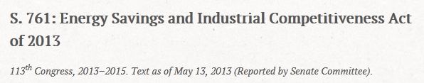 A new energy efficiency bill the Energy Savings and Industrial Competitiveness Act of 2013 (S. 761), which was introduced in the U.S. Senate by Senators Shaheen and Portman, has been reported out of committee. This bill, which appears to have broad bipartisan support, (for example, 3 Republican and 2 Democratic cosponsors), provides goals, incentives, and support for energy efficiency efforts across the U.S. economy including residential and commercial buildings and industry.