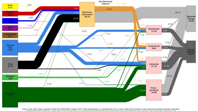 Lawrence Livermore National Lab has published a beautifully simple, but comprehensive graphic showing energy sources, uses and end user efficiency. Some interesting information gleaned from this diagram about energy use in the US in 2009,