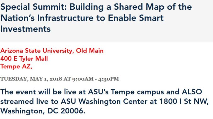 To begin to address this challenge National Academy of Public Administration (NAPA), Arizona State University (ASU), the American Geographical Society (AGS), and the National Academy of Construction (NAC) partnered to put on an event to convene leaders in public administration, infrastructure development, geography, geospatial, and data integration/open data. Entitled “Building a Shared Map of the Nation’s Infrastructure to Enable Smart Investments” , the event was held at Arizona State University in Tempe, Arizona.