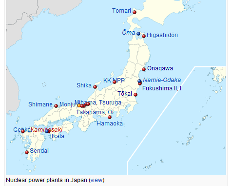 It appears that most if not all Japanese nuclear power plants are on the coast, presumably to take advantage of the sea for cooling.