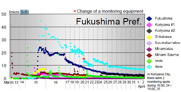 April 4 9:00 () JAIF has published graphical data showing trends in measured radiation dose rates in monitoring stations in Fukushima and neighboring prefectures between 20 and 100 km from the Fukushima Daiichi nuclear plant. Data is included for Iitate, where dangerously high rates were recently measured by the IAEA.
