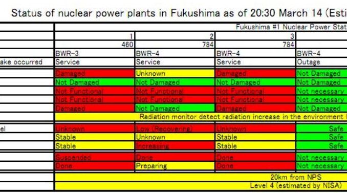 JAIF has updated its Fukushima reactor status spreadsheet as of 20:30 JST (07:30:00 am Monday March 14 Eastern Time). It reportes the integrity of the fuel rods in Unit 2 as unknown. It also reports increasing radiation detected in the environment.