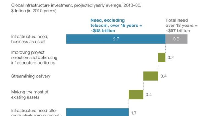 I blogged about McKinsey Global Institute’s (MGI) research into construction productivity back in 2012 after a presentation at an international infrastructure conference. The results of this research are encapsulated in a recent report where MGI has estimated that $57 trillion in infrastructure (roads and highways, rail, ports and seaports, electric power, water and waste water and communications) investment will be required from 2013 through 2030 ($3.2 trillion per year) just to support the projected growth in the world economy, estimated at 3.5% growth in world GDP annually. This is about 60% more than the $36 trillion that was spent over the past 18 years, but it still is not sufficient to address some of the major backlogs in infrastructure maintenance in developed economies, the infrastructure development goals of the emerging economies, or the cost of making the world’s economies more resilient to climate change.