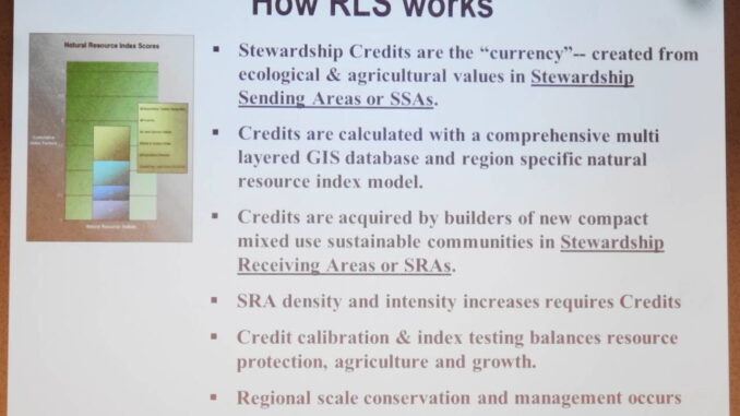 Al Reynolds presented a new and innovative schme for Rural Land Stewardship (RLS) that challenges the traditional paradigms of regulation (e.g. zoning) or land acquisition (e.g. Nature Conservancy) by incentivizing the protection of the habitat without public funding or regulation. Rural land stewardship is a private/public process based on scientific data and market-driven incentivization.