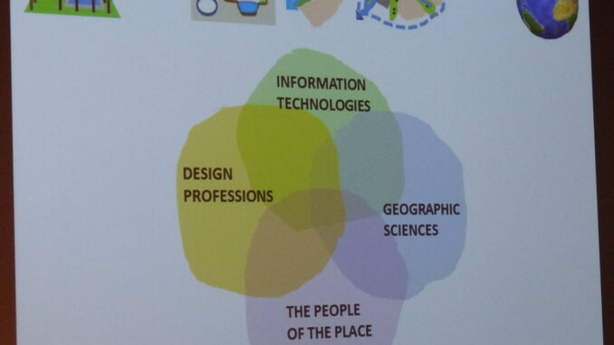 Geodesign involves bringing together the design professions (architecture and engineering), technology, the geographic sciences, and wha Carl calls the people of the place, the folks that are going to live in the result of a “geodesigned” environment. A major challenge arises from scale. Scientists approaach things from the universal anf global, designers from the local, even at the level of one building or one parcel.
