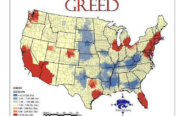 Kansas State University Geography has calculated quotients for the seven deadly sins for each county (I’m guessing) in the US and plotted the results as maps. Plenty of material here for blaming some other part of the country for the nation’s problems, but fascinating maps nevertheless.