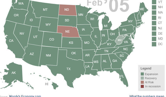 MSNBC and Moody’s have computed what they call an Adversity Index which attempts to measure the economic health of 381 metro areas and all 50 states and assign an economic health quotient, according to whether the state is assessed to be in recession, at risk, recovering or expanding.
