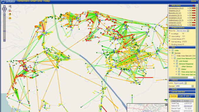 Geospatial technology is used by Tantalus customers in several different capacities. The first is to help identify problems or misalignment of resources in the radio frequency (RF) and electric grid network. Visualizing the RF and distribution network geographically enables customers to identify and resolve problems in the RF network. According to Dave Kauffman, Senior Product Manager for Applications and Interfaces at Tantalus, “GIS brings an entirely new dimension to problem solving for utilities. Before, our customers had to try to understand the source of problems by looking at tables and reports, but they found that with the geospatial view, the source of the problem, typically obstructions, became much easier to identify and correct.”
