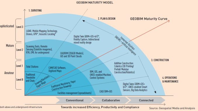 To make the key GEOBIM technologies concrete the report describes a GEOBIM Maturity Model that makes it possible to evaluate and assess the ability of an AEC firm to operate in an integrated geospatial+BIM environment. The GEOBIM Maturity Model extends across the entire construction lifecycle from planning, through design and construction to operations and maintenance. The levels of the GEOBIM Maturity Model increase as more innovation takes place in digital GEOBIM technology and the importance of the integration of geospatial and BIM technologies is recognized. For example, for surveying traditional theodolite and chain is characteristic of Level 0 in the maturity model. As more modern digital technologies are adopted levels rise; total stations (Level 1), laser scanning and GNSS, (Level 2) to mobile scanning, drones, ground penetrating radar and other underground locating and mapping technologies (Level 3). For planning and design, the increasing use of digital technologies compared to drawings and paper maps (Level 0), include CAD and digital maps (Level 1), BIM and 3D point clouds (Level 2) to digital twins of both above and below ground infrastructure and mixed reality (Level 3). For construction, traditional constuction machinery and paper drawings are being replaced by BIM models, digital geospatial maps and automated construction with GNSS, and prefab and additive building.