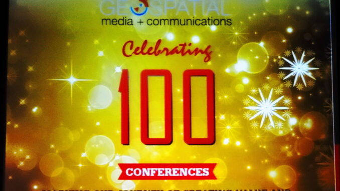 At the India Geospatial Forum today, Sanjay Kumar, the CEO of Geospatial Media and Commmunications, the organizers of the conference announced that this year’s India Geospatial Forum is Geospatial Media’s 100th conference. To mark the occasion, Sanjay presented a fascinating bit of background history about Geospatial Media.