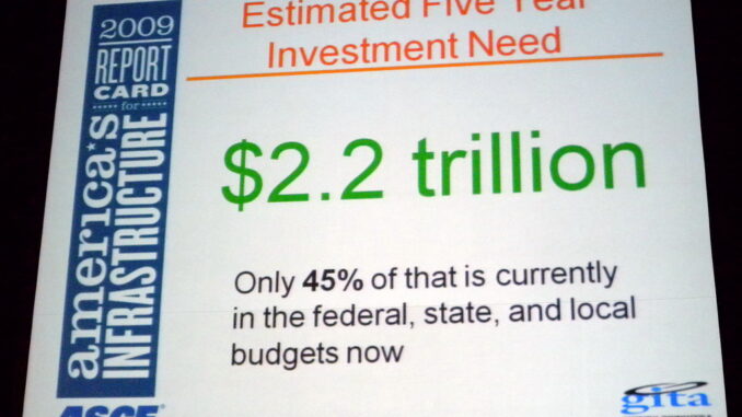 Blaine Leonard, of the Utah Department of Transportation and the President-elect of the American Society of Civil Engineers (ASCE), gave the opening keynote at GITA 2009 today. His talk focussed on the 2009 ASCE Scorecard on American infrastructure and what the stimulus means for addressing some of the infrastructure challenges that the ASCE has successfully attracted public attention to.
