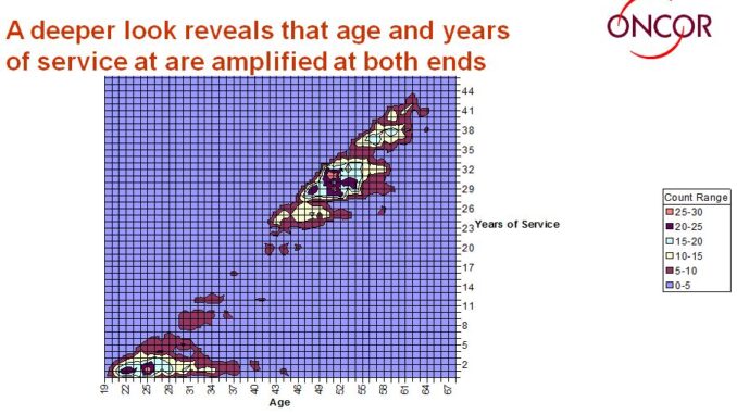 With an average age of 45, Oncor has a relatively youthful workforce compared to other North American utiltiies. But average age doesn’t convey the whole story. The workforce is really comprised of two cohorts, best exemplified by looking at Oncor’s 122 professional engineers, whose average age is a rather youthful 39. The engineers are grouped in two age clusters with very different levels of experience; 62 engineers average between 25 and 30 years of experience, and the remaining 70 engineers average about 2.5 years of experience. In other words there are very experienced engineers most of whom are soon to retire, and very inexperienced young engineers. Over the next 13 years 1,600 (about 42%) of Oncor’s 3810 employees will reach Oncor’s average retirement age of 60, an average of 120 per year.