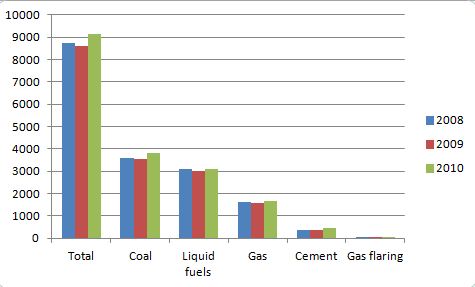 The largest contributors to total CO2 emissions were coal, liquid fuels, and gas combustion. CO2 emissions from coal increased 7.6 % over 2009.