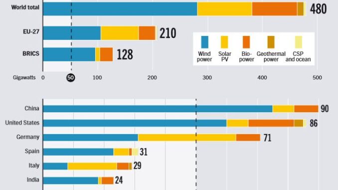 The BRICS countries (Brazil, Russia, India, China and South Africa) represent 36% of total global renewable power capacity and almost 27% of non-hydro renewable capacity in 2012.