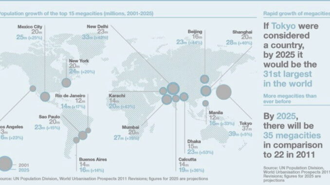 By 2025 the UN projects there will be 35 megacities (10m+) in comparison to 22 in 2011.