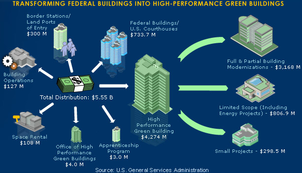 The American Recovery and Reinvestment Act (ARRA) has allocated $5.55 billion to the General Services Administration (GSA) for federal public building projects. Of this $4.5 billion is targetted on converting federal buldings into model green buildings. The GSA has submitted a list of proposed projects to Congress. Buildings were prioritized based on the speed at which jobs could be created and the magnitude of improved energy efficiency.