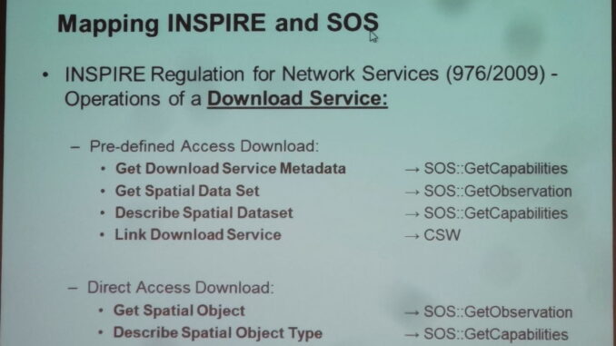 Today at the INSPIRE conference , Arne Bröring of 52°North gave an overview of an effort to make SOS and INSPIRE compliant. It appears that this will be feasible without any change to the existing SOS and INSPIRE standards. It is planned that an INSPIRE Technical Guidance document will be extended to include SOS compliance. In addition an open source implementation is planned.