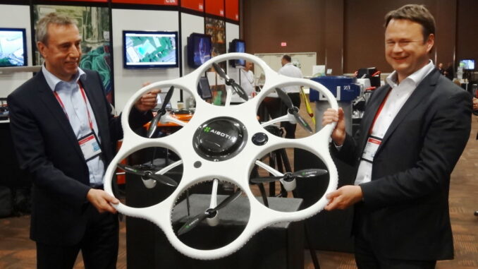 Juergen Dold, President of Hexagon Geosystems, announced a relationship between Leica Geosystems and Aibotix, a company that produces a hexacopter that can carry a payload, typically an off-the-shelf digital camera, of up to 2.5 kg for 20 to 30 minutes. The Aibot X6 can fly preprogrammed flight paths and take predefined aerial photos autonomously. With preprogrammed routes it is possible to make