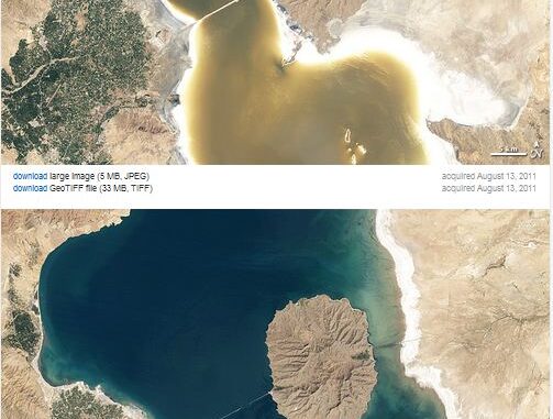 I just came across another, Lake Orumiyeh in northeastern Iran, one of the world’s largest landlocked salt lakes with a surface area of 5,200 km2. The images were taken in August 1998 and August 2011 and the shrinking of the lake is almost as striking as the Aral Sea. Some 60 streams and rivers feed Lake Orumiyeh. The shrinking has been attributed to population growth, diversion of rivers for agriculture, and climate change.