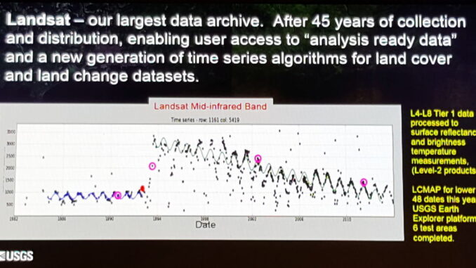 At GeoBuiz Virginia Burkett gave two very intriguing examples of how the USGS is finding new and interesting roles for itself. The USGS continues to develop with NASA the Landsat series of satellites. Landsat 7 and 8 are currently operational, and two more, Landsat 9 and 10, are in development to replace them. The USGS is finding new ways to reuse the existing Landsat data that currently stretches back to 1972. Using data cube technology the USGS is able to track individual (cloud free) pixels over time, currently back to Landsat 4, but ultimately to Landsat 1. She gave an example of a pixel in a forested area of the US which recorded the evolution of the forest since 1982 including a fire and the slow recovery after the fire.