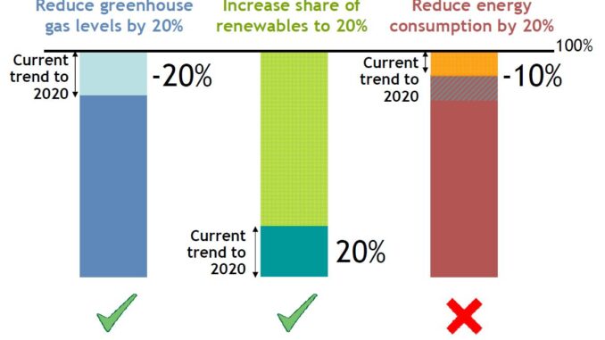 The European Union has set itself agressive goals to reduce GHG emissions by 20%, increase renewables share of energy generation to 20%, and to reduce energy cinsumption by 20% by 2020. The EU seems to be on track for the first two goals, but the third remains a challenge. In the EU something like 40% of energy is consumed by buildings, heating and lighting being the largest factors.
