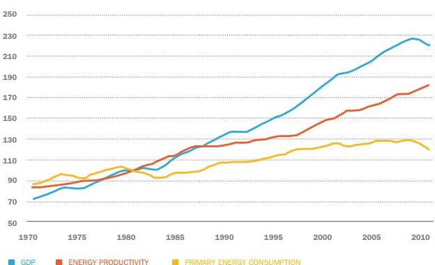 The energy productivity of the United States has increased by more than 85% during the paat three decades. Energy productivity, often called energy intensity, is the gross domestic product divided by the total energy consumed and is a measure of how much energy is required to produce a dollar of GDP. Developong countries like China, whose per capita emissions are much less than the U.S., prefer energy intensity as a measure of their contribution to emissions reduction.