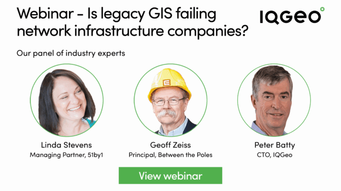 I thought it would be worthwhile to include here an expanded version of my contribution to a webinar that IQGeo presented last week with a provocative title that I think goes right to the nub of the challenge that telecom and utility companies are facing in developing digital twins of their network assets. In this new world there is an exponentially increasing volume of real-time data and less and less time to conduct analyses and make decisions. Telecoms and utilities and finding that their legacy GISs are simply not up to the task. The webinar aimed to shed some light on the problems that telecoms and utilities are facing with their legacy GISs. The webinar speakers were Linda Stevens, Managing Partner at 51by1, Peter Batty, Chief Technology Officer at IQGeo, and myself. It was moderated by Steve Tongish of IQGeo. The full webinar is available on demand here.