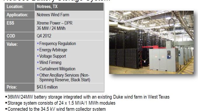 The 24 MWh battery storage park developed by Duke Energy Renewables to store power generated by the nearby Notrees 153 MW wind farm in west Texas became operational in December 2012. The project was announced in 2009 and is supported by a matching a $22 million grant from the US Department of Energy (DOE) which is part of the DOE Office of Electricity Distribution and Energy Reliability (OE) effort to modernize the electricity grid