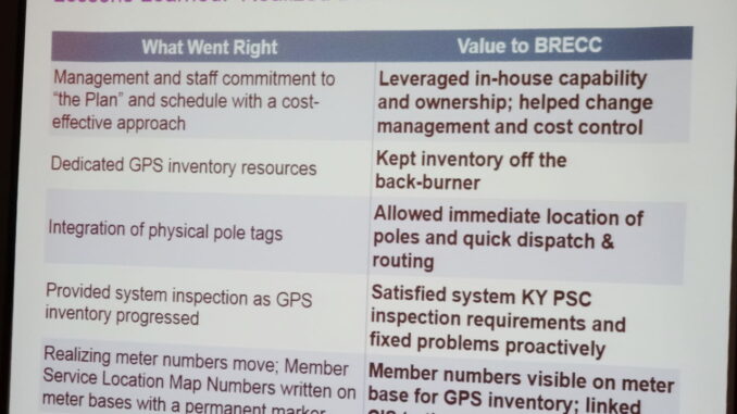 - Greater resilience – outages are fewer and of shorter duration because reliable location data fro their assets means they can respond faster. Linesmen non only know exactly where a downed pole is, but also exactly what equipment is on the pole. Nathan Frisby said he was uncertain whether he would be able to attend the NRECA conference to give his talk because they experienced an ice storm in the beginning of the week. But he said that their distribution system is so much more reliable now that he was able to make it to the conference.