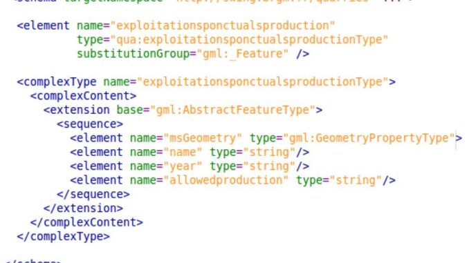 The authors give an example from a GML document of an XML schema that defines a class or feature type exploitationsponctualsproduction. They point out that from the information in this schema you can’t tell what the data described by this schema represents. The name is confusing and the attributes don’t provide any additional information. Whose name is the value of name, what does the attribute year refer to, and how is the allowedproduction measured?