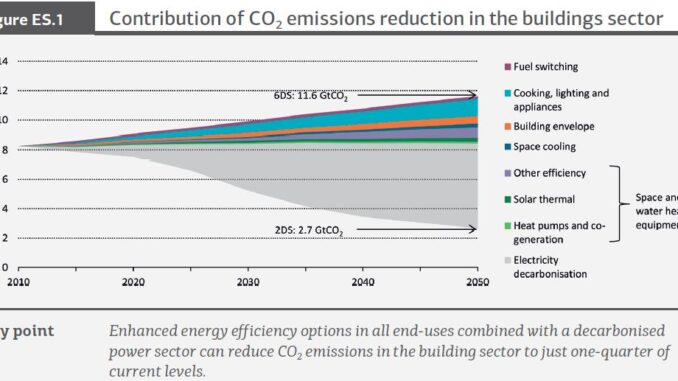 The IEA has estimates that limiting global temperature rise to2°C would require a 77% reduction in total CO2 emissions by buildings by 2050 compared to today’s level. To achieve this will require energy demand reduction, increased use of renewables and decarbonised electric power generation.