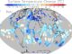 The red dots on the map are the locations of the monitors. Each line on the graph represents the frequency recorded over time by a monitor. Frequency is shown as the vertical scale on the graph on the left and the color-coded map legend on the right.
