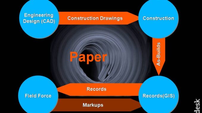 Utilities and telecommunications have been facing problems arising from the inefficient flow of engineering design data from designers to the construction subcontractors to records (outside of North America referred to as network documentation) and between records and operations. The problems that can be attributed to what is really a pathological paper-based information flow include poor data quality, redundant data, inefficient field operations, and others. I’ve bloggedseveral times about this in the past. In many utilities and telcos the records department redigitizes from paper as-builts the same data that was created in electronic form by engineering. This is the source of a number of problems including as-built backlogs, data errors, and the inefficient use of valuable staff.